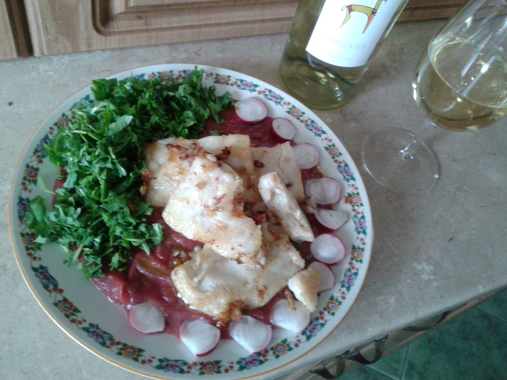 Etap pierwszy: morszczuk smażony, na sosie grejfrutowym i z zieleninką.