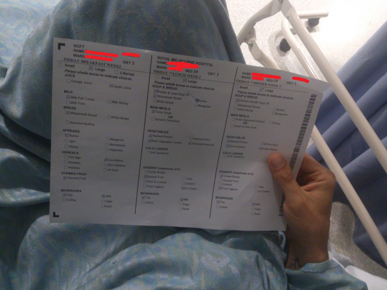 Jeśli chodzi o Australię to w szpitalu publicznym pacjent wybiera dzień wcześniej z menu co będzie chciał jeść. Można np. steka.