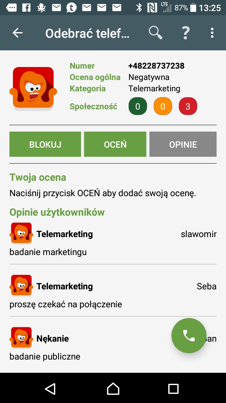 W moim nowym telefonie z natury rzeczy, jeżeli numer dzwoniący nie jest zapisany w kontaktach , wyświetla się coś takiego jak "Nie odnotowano aktywności spam". Co prawda jeszcze nigdy nie wyświetliło mi się "To jest SPAM!", ale chyba to korzysta z tej samej bazy danych co ten program, a jest zaszyte w samym Androidzie, albo nakładce Samsunga.