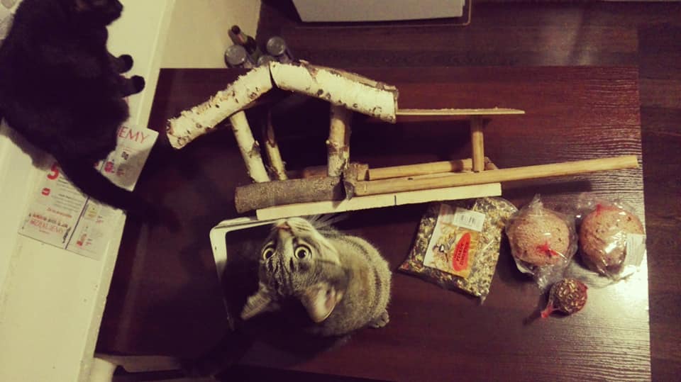 3.Powiększony karmnik (w celu przyjęcia wiekszej ilości gości ,których z chęcią pofocę ;) ),gotowe kule zbożowe i ziarno dla ptasiorów