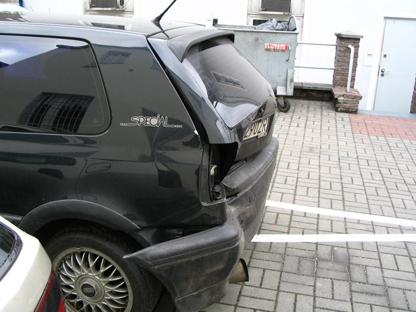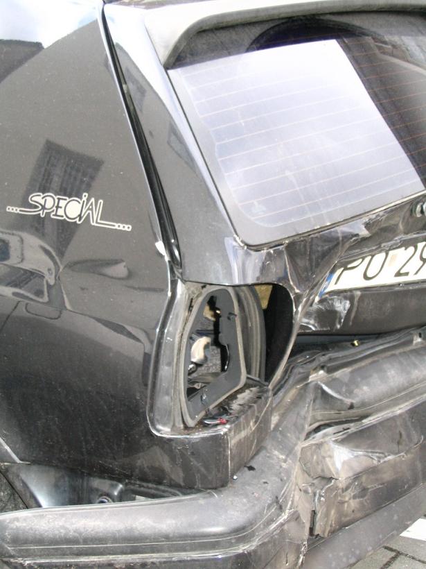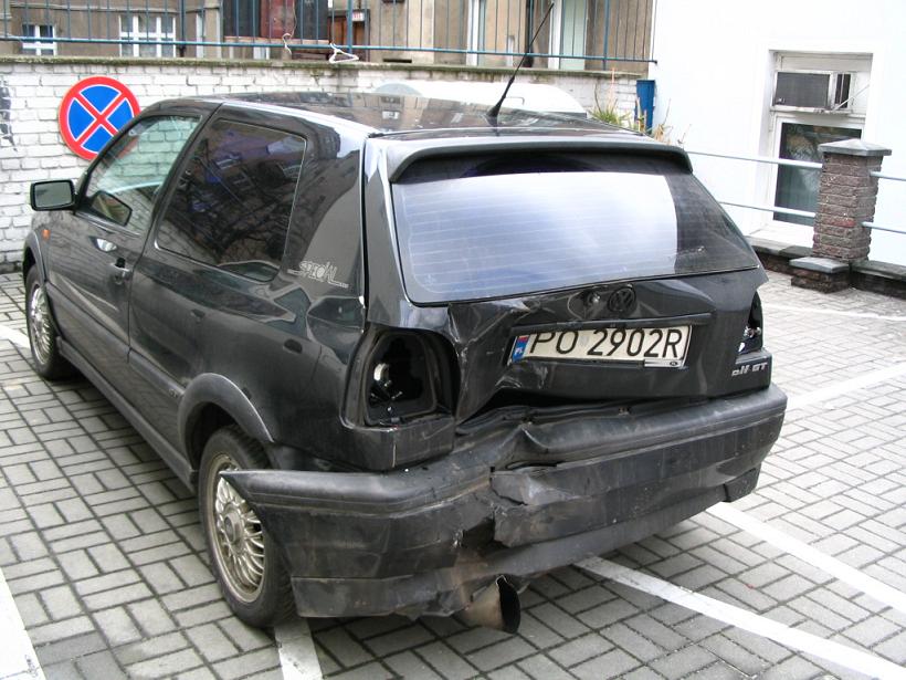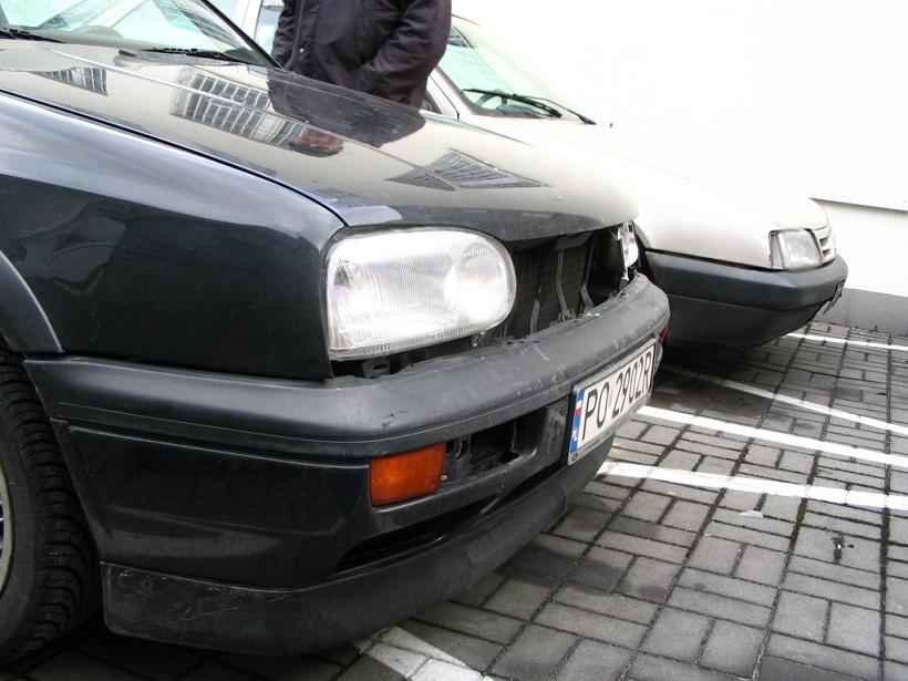 Lat temu ze dziesięc, miałem piknego Golfa III GT - no zbierałem na niego, zbierałem aż w końcu kupiłem. To takie pierwsze moje moje auto było. Nie minął miesiąc od kupna, pojechałem sobie spokojnie do pracy w sobotę. Ruch w interesie od rana mały, to się szwendaliśmy po salonie. Nagle usłyszeliśmy pisk opon, uderzenie i krzyk. Lecimy do okna - i w sumie nic nie widać. Tylko jakieś CinkCinko bez przedniego zderzaka stoi przed naszym salonem i goście się kłócą na potęgę. Ogólnie spokój. Mija godzina - przyjechała policja. Moje auto zaparkowane było na chodniku wzdłuż jezdni za jakimś poldkiem, tuż za przejściem dla pieszych. Tavria jakoś dziwnie bokiem za mną zaparkowała, ale co tam.Stoimy se w oknie, mija kolejna godzina, mamy ubaw po pachy bo się goście wyzywają, leją i w ogóle sceny jak na prowincji. Nie wiem tylko cymu policja razem z tymi gościami tak chodzą w kółko od Cinkusia do Tavrii i za każdym razem oglądają moje auto - przecie je widzę z okna i jest w porządku zaparkowane, żadnych przepisów nie złamałem. W końcu mnie zdrzaźnili - ide obaczyć o co lotto... uklęknąłem... tyłu ni ma, przód w drzazgach... tylko drzwi boczne całe...