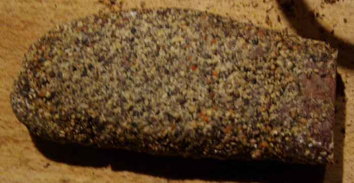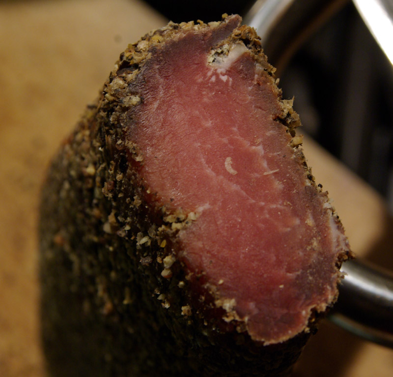 Obtoczyć w grubo mielonym pieprzu i kolendrze (ziarno) i włożyć w pończochę (włożyć, zakręcić i przełożyć ponownie i powtarzać aż pończocha się skończy). Pończocha jest po prostu imitacją warunków spowolnionego wysychania (chyba, że ktoś ma komorę z wilgotnością 85%).