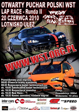 Stowarzyszenie Warsaw Speed Team ma zaszczyt zaprosić Cię na drugą rundę Otwartego Pucharu Polski WST - Lap Race. Zawody odbędą się 20 czerwca 2010 roku na lotnisku w Ułęży koło Ryk.
