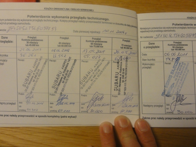 Dodaje zdjecie ksiązki serwisowej w ASO u Koper'a oraz w 2011 na Bajecznej, przebieg jest autentyczny czyli około 12 000 kilometrów rocznie. Amortyzatory tylne zmieniłem na Kabaya, także ten problem następny właściciel ma z głowy.