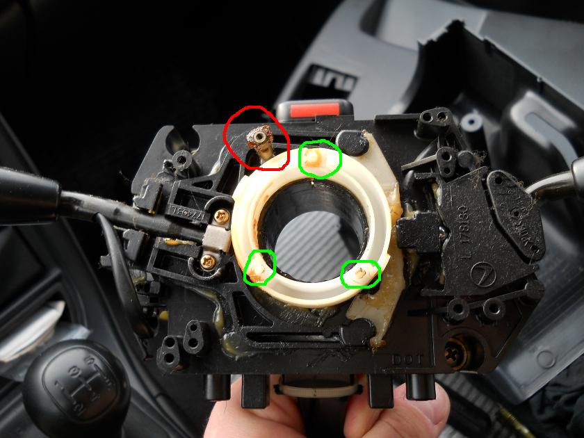 Wklejam fotkę z przełącznikiem czerwone kółeczko to bolec do sygnału dźwiękowego, a czerwone kółka to wypusty-bolce do przełączania kierunków.