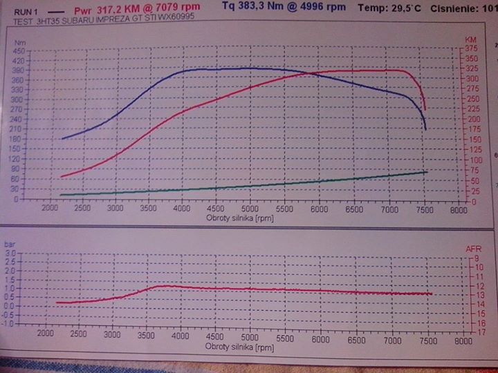 skończyłem stroić swoją imprezę GC8 z silnikiem od STI bugeye z 2004 roku o bazowej mocy 265 HP i zastanawiam się co sądzicie o tym wykresie i wynikach.