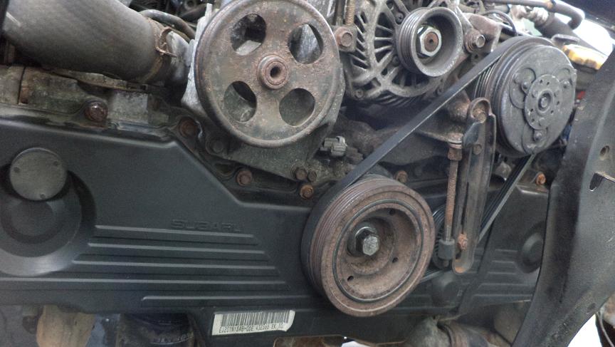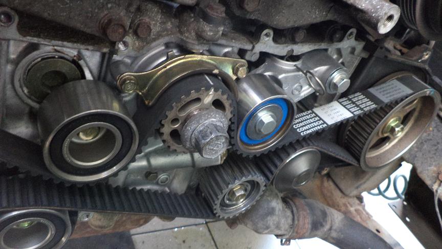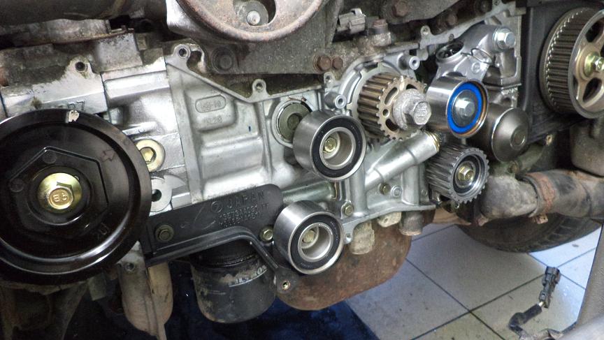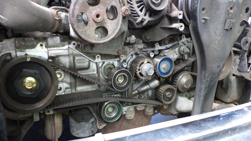 JEDNAK Zawsze zalecam wymianę pompy wody na nową, większość z Nas wie że zagrzać subaru jest dość łatwo - nie ma sensu ryzykować. *Ustawiamy rozrząd- znaki są dość łatwo zauważalne ( pomaga Nam nawet oznaczenie na pasku ) niemniej nalegam na manuala albo osobę która ogarniała już temat rozrządów. Osoba mało doświadczona może narobić krzywdy. Zwalniamy blokadę napinacza.