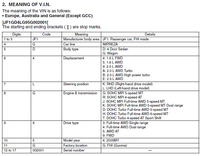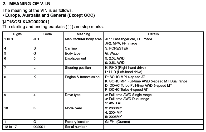 limesiak, bingo. Mam te manuale, ale nie zajrzałem do wszystkich. Rozpiska VIN jest w 2003 Service Manual EU.pdf na stronie 34. Teraz wszystko jasne. Dla Forestera 2003 EU mamy: