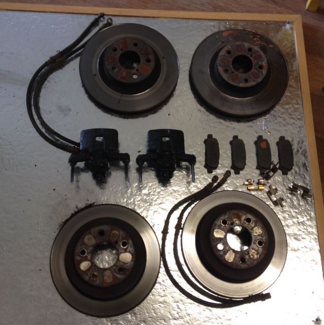 Tarcze tył 266 mm + klocki TRW po przebiegu 5 tyś. km + zaciski jednotłoczkowe pomalwoane na czarno ( gumki całe) + przewody