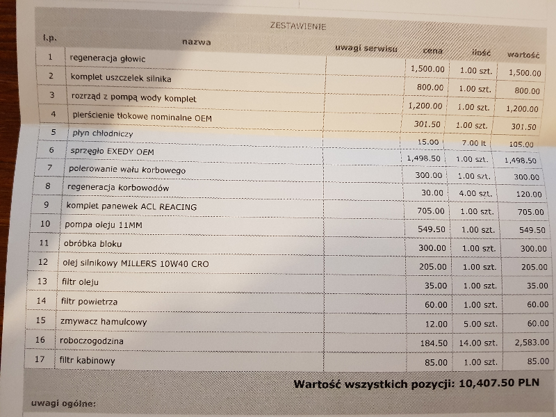 Silnik z kompletem osprzętu (intercooler, turbina, pompy, kompresor, kolektory, sprzęgło itd., jedynie rozrządu brak). Jak widać na zdjęciu, głowice były regenerowane. Nie mogę znaleźć zlecenia, ale turbina też była regenerowana, nieco później, przy przebiegu 254kkm (lipiec 2018, koszt razem z montażem i demontażem 1800 zł). Pompa oleju, choć była wymieniona na nową, jest do sprawdzenia po panewce - powinna być ok.