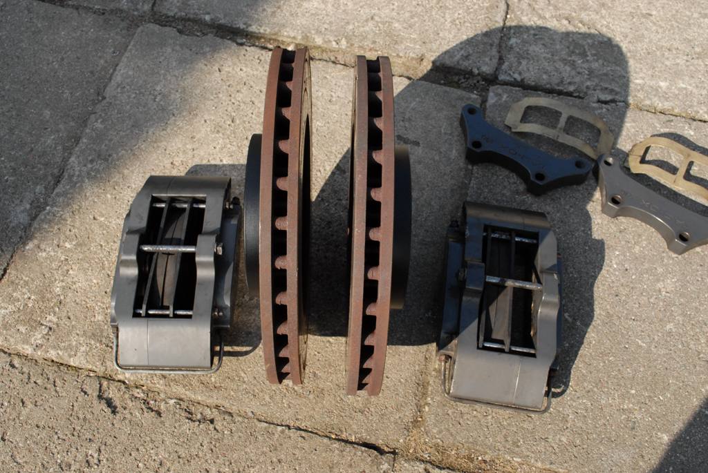 W skład wchodzą zaciski, klocki mintex, tarcze tarox f2000 325mm w idealnym stanie, śruby mocujące blaszki i adapter.