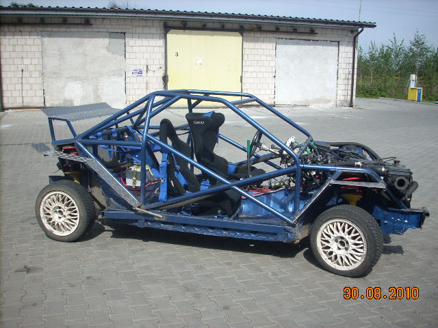 Dwa kubełkowe fotele , szerokie 4 punktowe pasy z centralnym zapinaniem, rajdowa kierownica z odsadzeniem i nabą na kolumnie z regulacją wysokości, super działający hydrauliczny hamulec ręczny( zablokujesz koła zawsze!!;) .. korektor siły hamowania...zmienia balans siły hamowania przód/tył, podstopnik dla kierowcy aby lepiej czuć i operować pedałami w czasie agresywnej jazdy. Wszystko ochraniane solidną i mocno rozbudowaną klatką bezpieczeństwa. Dla bezpieczeństwa a także dla poprawienia wyważenia auta chłodnica została przeniesiona na tył( jak w autach rallycrossowych)