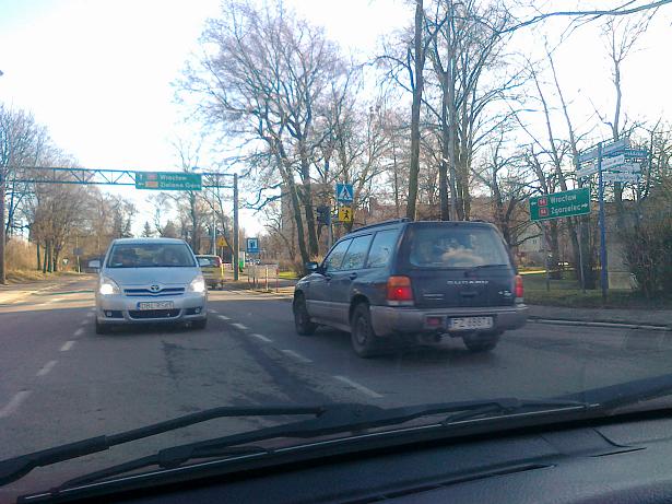 Pozdrawiam Pana spod Tesco - właściciela srebrnego Foresterka na świdnickiej rejestracji, z którym zdążyłem zamienić dwa słowa, po czym spotkałem kumpla, którego chyba z dziesięć lat nie widziałem, następnie oklejonego bloba, albo hawka, za nim bodaj szarą GC8 - nie widzieli chyba, następnie klasyka ze wściekłymi felgami - tu pięknie odmrugane, Forek też stał przed przejazdem na rondzie - wylotowa do Bielawy, no i te dwa wspomniane Foresterki.