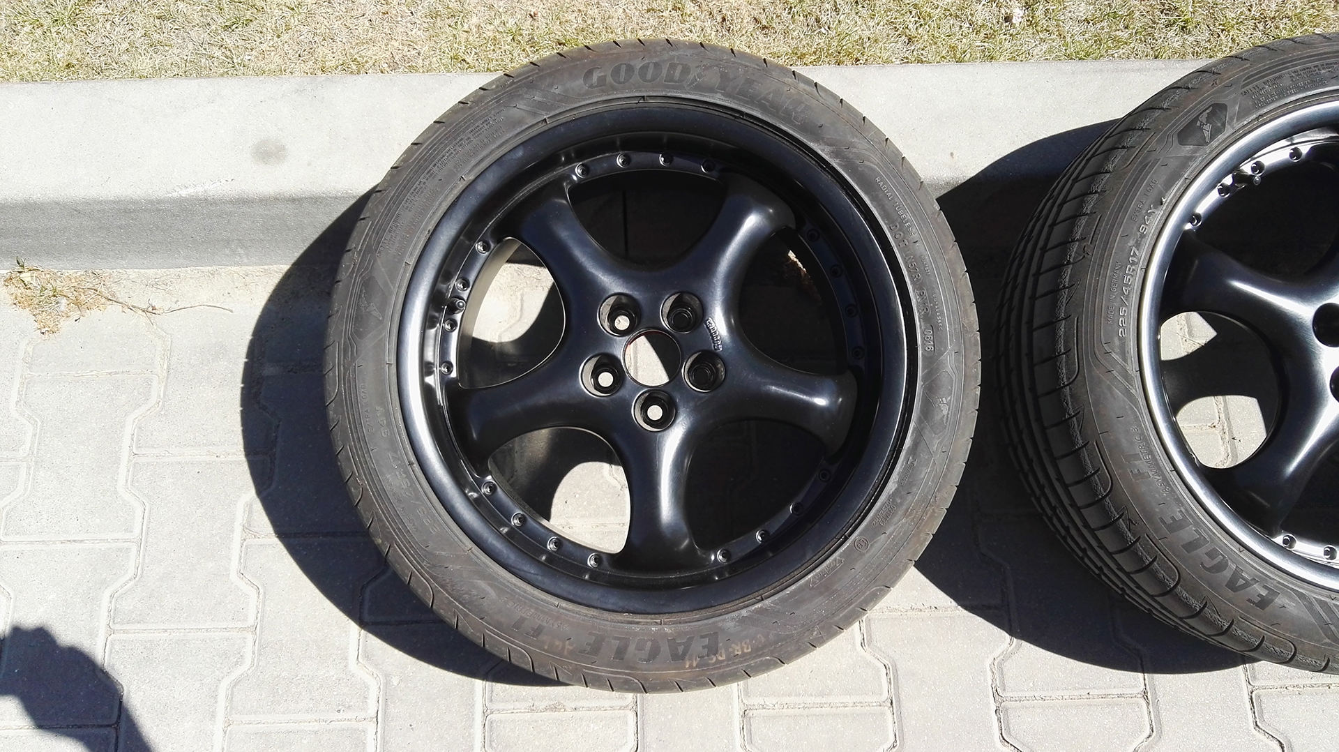 Felgi proste, malowane proszkowo na czarny mat, stan niemalże idealny. Przejechałem na nich ok 50 km od momentu renowacji, mogę również sprzedać bez opon za 1 000 lub same opony za 400 zł. Jedna para opon Goodyear Eagle, druga Dunlop Sport Maxx. Dekielki są ale niestety w kiepskim stanie, dorzucam pierścienie centrujące. Mogę podesłać więcej zdjęć na maila. kontakt: 881 428 988