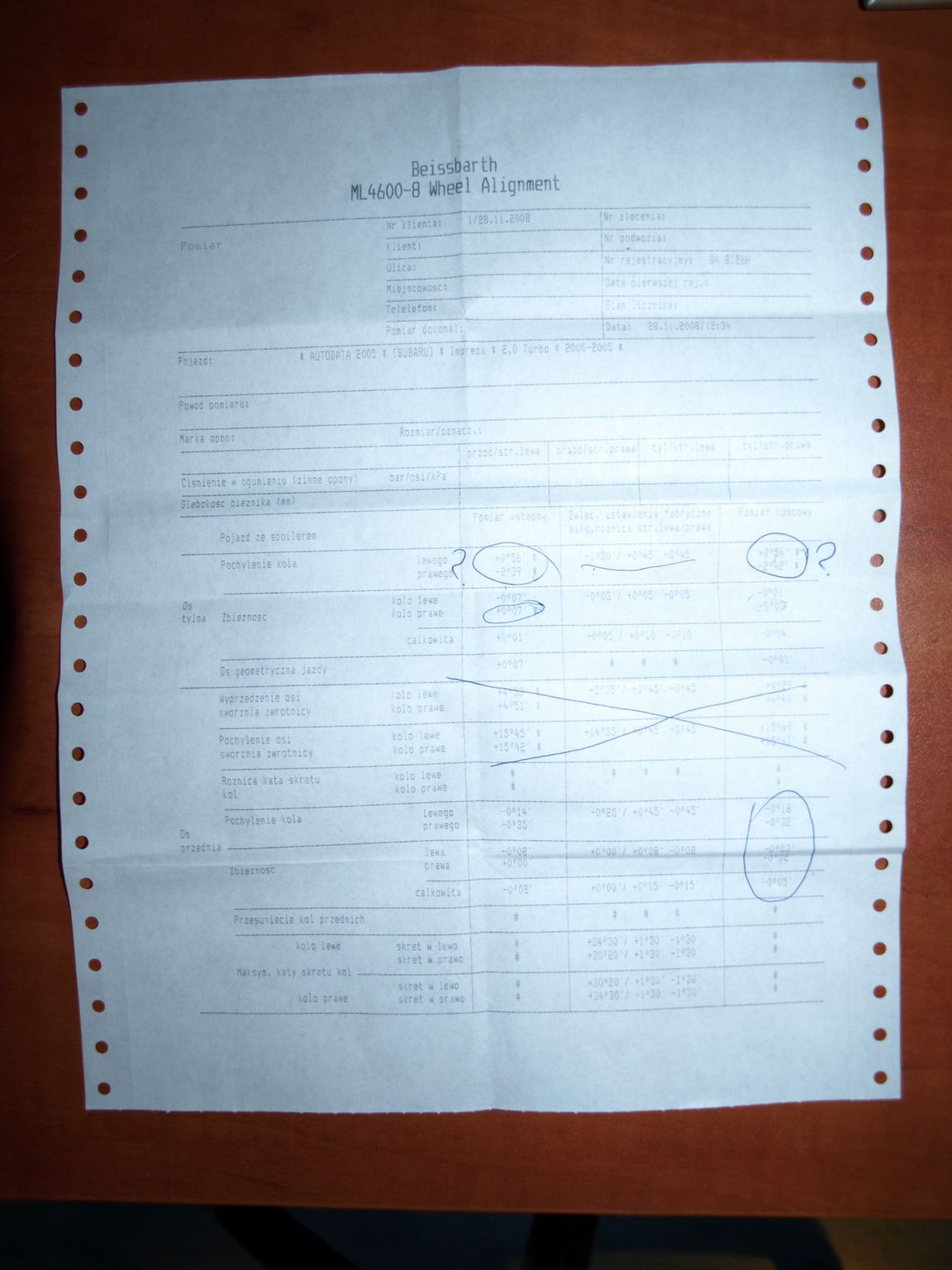 To co chce zrobic jutro (jak uda mi sie umowic u wulkanizatora) to wymiana felg (dzisiaj przyszedl nowy komplet felg) i wtedy udac sie jeszcze raz na geometrie - wydaje mi sie, ze wtedy wyniki nie beda zafalszowane. Macie jakies rady? Jak nie to bedzie trzeba zmienic amorki i zwrotnice ;)