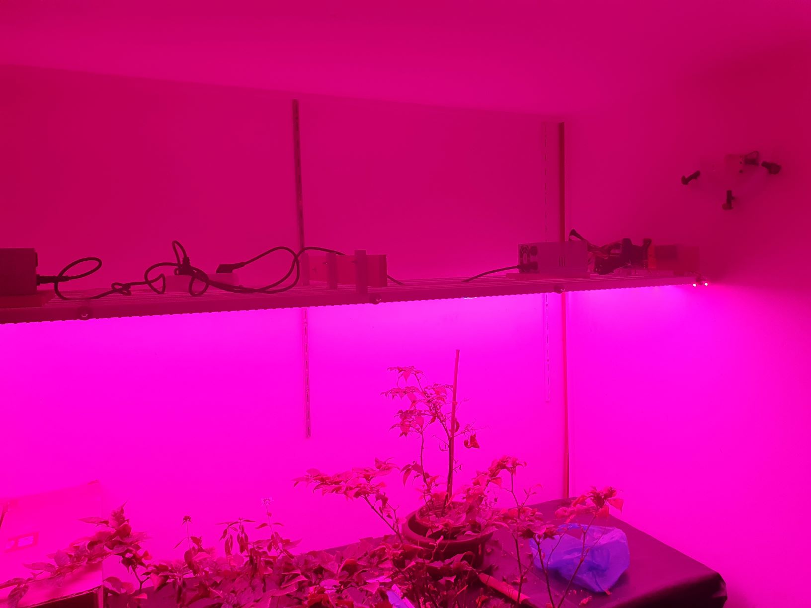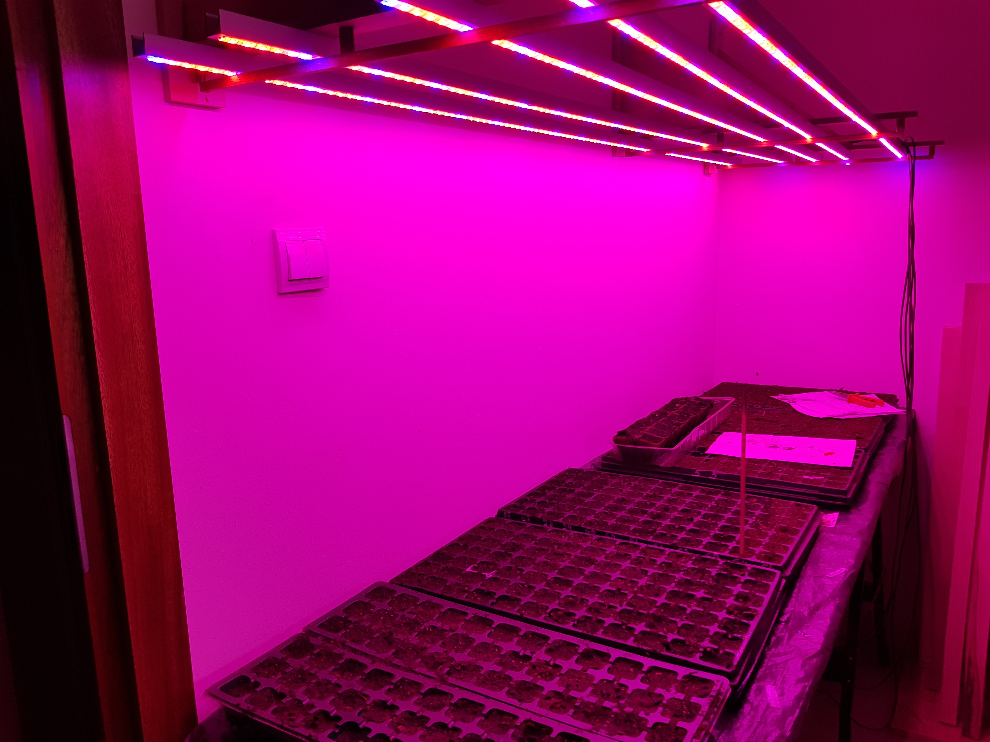 Na ceowniki naklejone taśmy grow led, zasilanie zrobiłem ze starych zasilaczy komputerowych, których mam jescze skrzynkę. Całość zawieszona na podpórkach do półek i na listwy na ścianie. Dzięki temu można regulować wysokość, co się b. przydaje jak siewki rosną. Podłączone do prądu przez zegarowy włącznik ustawiony 12/12.