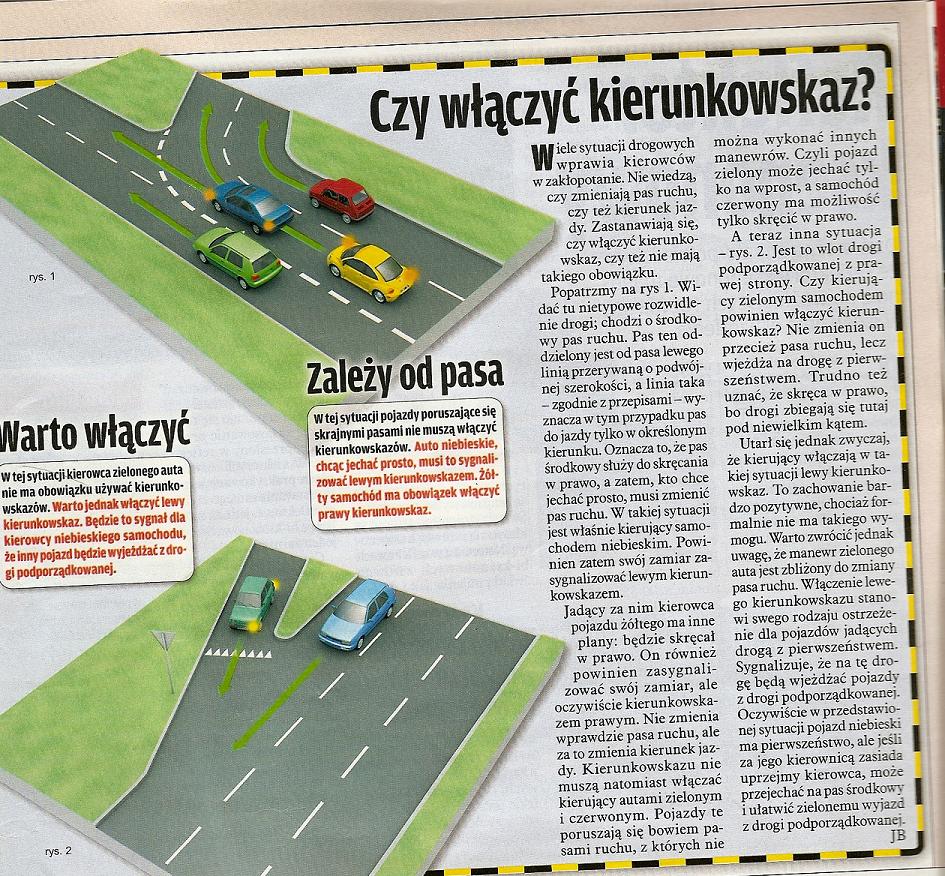 SYTUACJA 1 - moim zdaniem niebieski nie powinien sygnalizować jazdy na wprost, argumentacja piszącego że jest to pas jadący w lewo i niebieski musi sygnalizować chęć zmiany pasa jest bzdurna, moim zdaniem jazdy na wprost nigdy nie powinno się sygnalizować, oczywiście może ciutkę pomóc jeśli np. mamy łamane pierwszeństwo w lewo a my jedziemy prostu a z przeciwka ktoś chce się włączyć do ruchu no to jak my mu migniemy to on będzie miał więcej pewnośći gdzie my jedziemy, ale w 99% przypadków nie ma sensu sygnalizować, szkoda że autor textu nie powiedział o łamanych pierwszeństwach, na których niestety mało kto sygnalizuje że skręca np. w lewo z pierwszeństwem przejazdu.