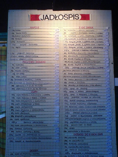 następnie, należy dokonać transakcji - a wybór nie jest prosty - menu jest, jak widać na załączonym wyżej obrazku, bogate. Arno decyduje się na kaszę gryczaną ze słoniną, upewnia się, że są w kaszy skwarki i próbuje zapłacić banknotem pięćdziesięciozłotowym, doprowadzając tym samym panią kasjerkę, siedzącą bezpiecznie za podwójną szybą, do suchości w przełyku oraz wytrzeszczu oczu, a nas wszystkich, tym samym, do łez. rrosiak zamawia fasolkę po bretońsku, Gal idzie tym samym tropem, ja idę w opcję kawiorową - zamawiam wątróbkę z cebulką oraz ruskie. Po chwili wszyscy mamy kwity potwierdzające zawarcie transakcji